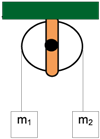 Perhatikan gambar di samping! Gesekan tali dan katrol diabaikan. Jika massa m1 = 5 kg, g = 10 m.s−2 dan m1 bergerak ke bawah dengan percepatan 2,5 m.s−2, maka berapakah massa m2?