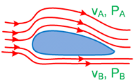 Tekanan di bawah sayap PB, harus lebih besar dari tekanan dari atas sayap PA. Ingat tekanan besar, kecepatan kecil, tekanan kecil kecepatan besar, sehingga kecepatan dibawah sayap vB lebih kecil dari kecepatan di atas sayap pesawat vA.